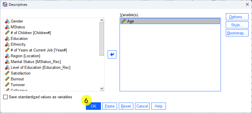 SPSS Descriptive Statistics example - steps of doing mean analysis for age- Steps 4 and 5