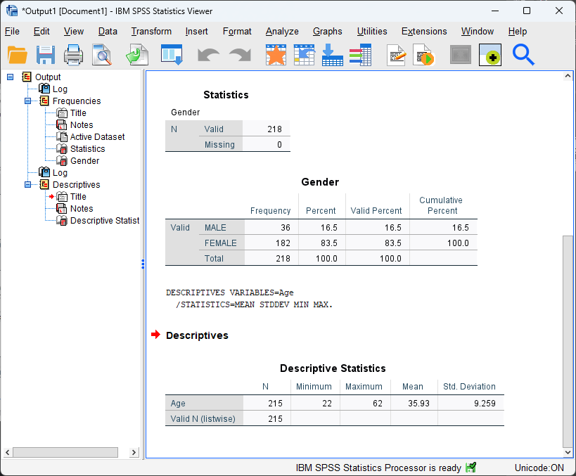SPSS Descriptive Statistics Results of frequency analysis - Variable of Gender - frequency and percentage of male vs fremale participants