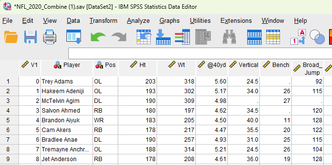 We are going to use the NFL data 2020 combine data for this correlation analysis. In particular, we want to see whether there is a relationship between athletes’ height (Ht) and weight (Wt).